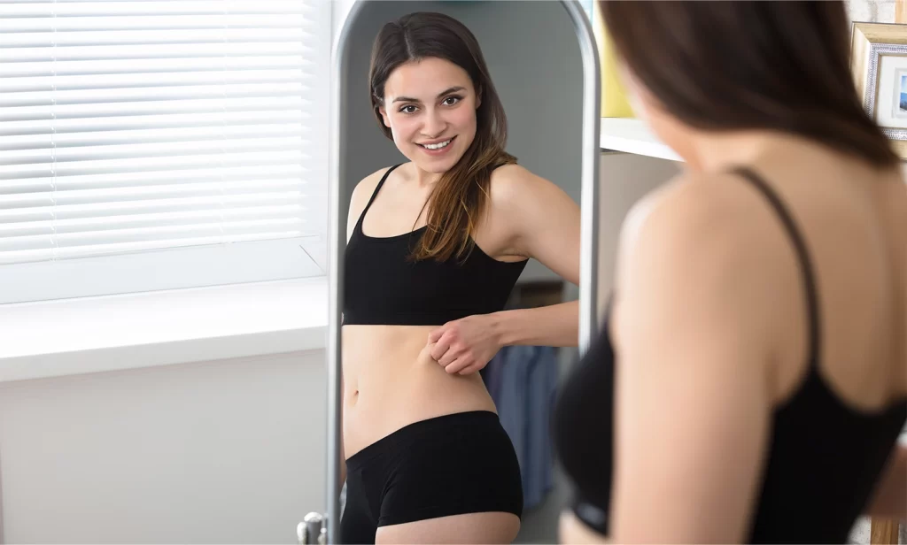 Cintura marcada, abdômen mais plano e curvas proporcionais.